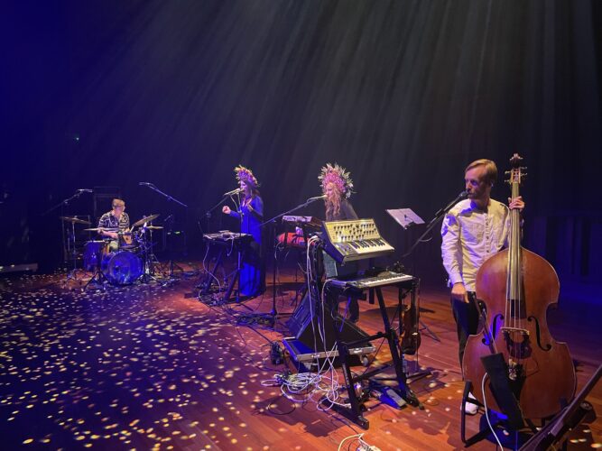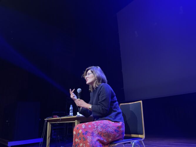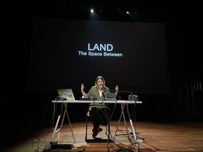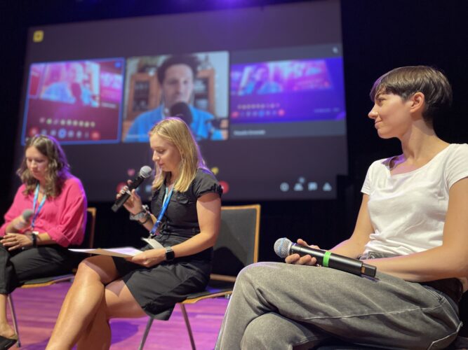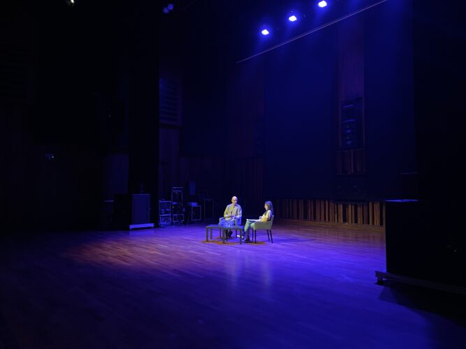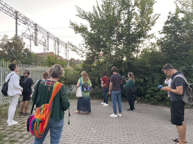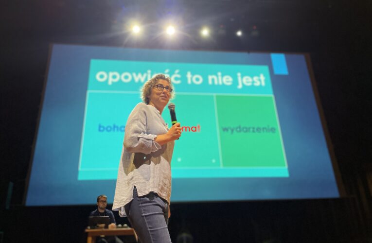 Wykład performatywny Kathariny Smets i Inne Eysermans, która na żywo tworzyła muzykę do słów Kathariny, zawładnął publicznością i wciągnął ją w podróż dźwiękową nie do zapomnienia. Inne jest z wykształcenia artystką muzykiem, autorką tekstów do piosenek, często współpracuje z Kathariną Smets przy jej niezależnych produkcjach. Katharina, która jest wykładowczynią audiostorytellingu w Królewskim Konserwatorium w Antwerpii, w artystycznym działaniu „Between me and You. Między mną a Tobą. Dokumentalista dźwiękowy wobec bohatera” opowiadała o przestrzeni między autorem i narratorem, a potem odbiorcą. W dziele sztuki dźwiękowej można być narratorem nie wychodząc ze swej roli i stać się niewidzialnym reżyserem, co zresztą wybrzmiało też w wykładzie Agnieszki Czyżewskiej-Jacquemet. Struktura opowieści dźwiękowej jest dowodem na jej konstruowanie i kreowanie. W dokumentach audio, wymagających pogłębionego słuchania i uważności, „ja” nie istnieje bez „ty”, „ty” nie istnieje bez „ja”, opowieść nie istnieje bez słuchacza. Pomiędzy tymi elementami wytwarza się niesamowita twórcza energia. Katharina jest autorką książki, która powstała na podstawie jej pracy doktorskiej „Between Me and You. On the attitude of the audio documentary maker” (2023, AP Hogeschool, University of Antwerp).