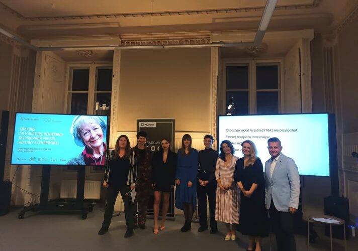 Tak właśnie się stało! Na Konkurs, który zorganizowaliśmy przy wsparciu Fundacji Wisławy Szymborskiej oraz Miasta Kraków napłynęło trzydzieści prac z całego świata. Wśród autorów i autorek znalazły się m.in. osoby z Włoch, Chorwacji, Stanów Zjednoczonych, Danii i Niemiec. Nagrody zostały przyznane w dwóch kategoriach: mini-dokument i mini-słuchowisko. We wrześniu, podczas krakowskiej Nocy Poezji, w pięknej Sali Pałacu Potockich, ogłosiliśmy nazwiska laureatek. Najlepszą miniaturę dokumentalną pt. „Psalm” przygotowała Nanna Hauge Kristensen (Dania), zaś zwyciężczynią w kategorii słuchowiskowej została M. Christina Marras (Włochy), której miniatura „My non arrival” poruszyła nas wszystkich.